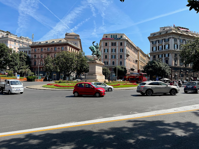 I stayed underneath it's shaded porticos until I re-emerged in the Piazza de Ferrari. The statue is of Guiseppe Garibaldi, a military hero from the Italian unification. On one of the lamp posts was this interesting insignia; I learned it's the seal including the flag of Genoa taken from the cross of Saint George.